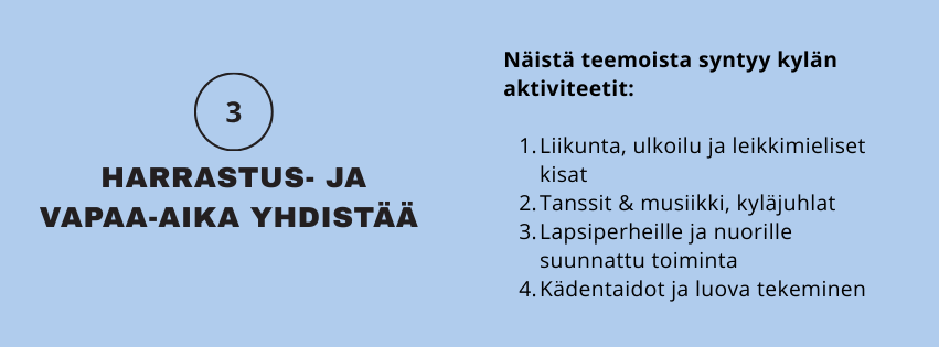Harrastus- ja vapaa-ajantoiminta nousi kehittämistyössä keskeiseksi yhteisöllisyyttä vahvistavaksi tekijäksi. Kyläläiset toivovat erityisesti matalan kynnyksen toimintaa, joka on mahdollista toteuttaa talkoovoimin ja pienin kustannuksin. Jo olemassa olevat ja toimiviksi koetut aktiviteetit – kuten liikunta, sählyillat ja pubit – koetaan tärkeiksi ja niiden toivotaan jatkuvan. Toiveissa korostuivat myös musiikki, tanssi sekä se, että tapahtumissa huomioidaan lapset ja nuoret. Tämä tukee pitkäjänteistä ja sukupolvet ylittävää kylätoimintaa.