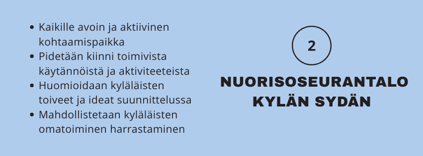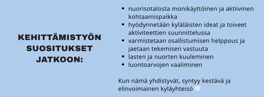 Uuden nuorisoseurantalon merkitys nousi aineistossa poikkeuksellisen vahvasti esiin. Se nähdään kylän sydämenä ja yhteisenä olohuoneena – paikkana, jossa yhteisöllisyys konkretisoituu. Talolta toivotaan avoimuutta, monikäyttöisyyttä ja mahdollisuuksia sekä ohjattuun toimintaan että kyläläisten omaan harrastamiseen. Yhteiset keskusteluillat, vapaat vuorot ja erilaiset tapahtumat voivat vahvistaa tunnetta siitä, että talo on aidosti kaikkien.