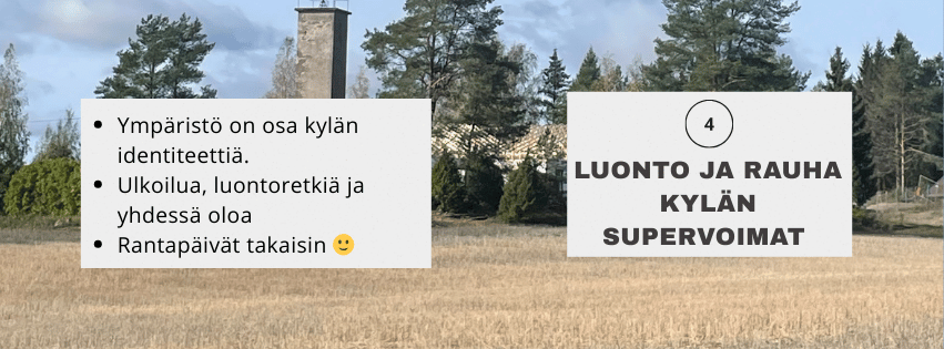 Luonto ja kylän ympäristö ovat Ruuhijärven selkeitä vahvuuksia. Rauha, maaseutumaisemat ja luonto koettiin tärkeiksi osaksi kylän identiteettiä. Toiveet luontopoluista, retkistä, rantapäivien uudelleen herättämisestä ja urheilukentän aktiivisemmasta käytöstä osoittavat, että luonto ja yhteisöllisyys kulkevat käsi kädessä. Yhteinen ja kestävä luonnon hyödyntäminen tukee sekä hyvinvointia että kylän tulevaisuutta.